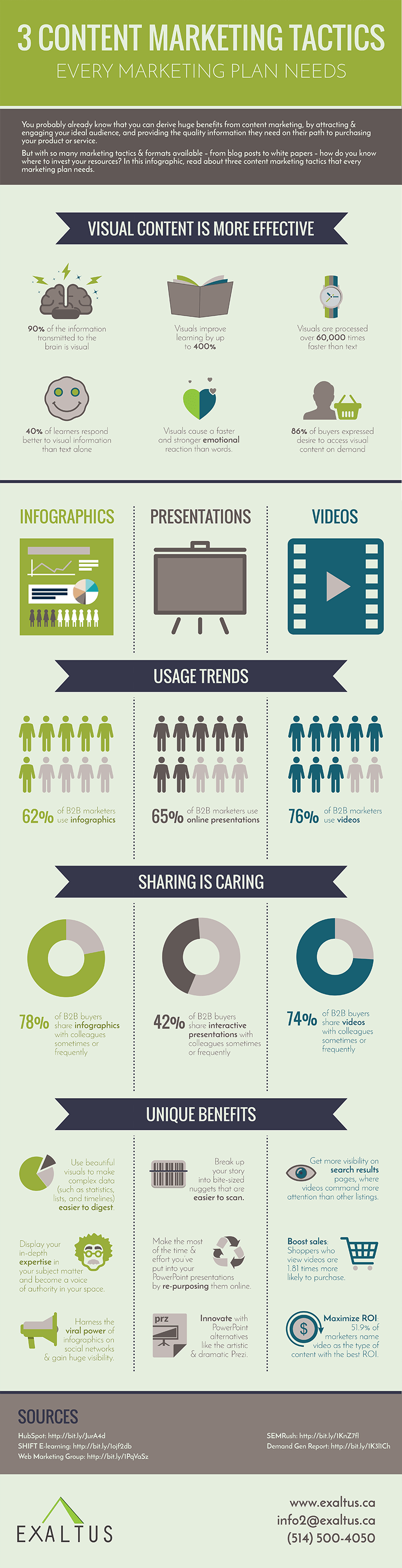 Exaltus produced this infographic highlighting the three content marketing tactics that every marketing plan needs.