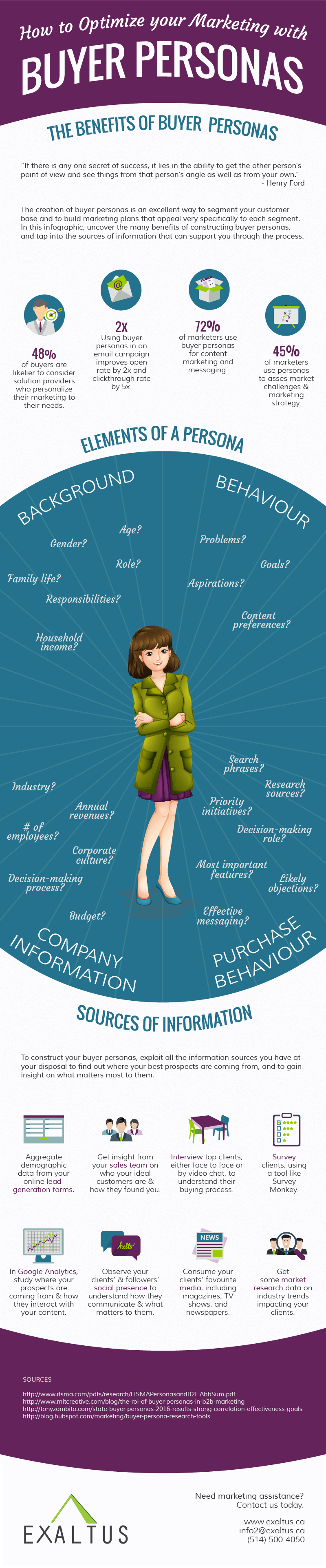 Exaltus produced this infographic highlighting the benefits buyer personas, the elements they should include, and the information sources that can fuel the process.